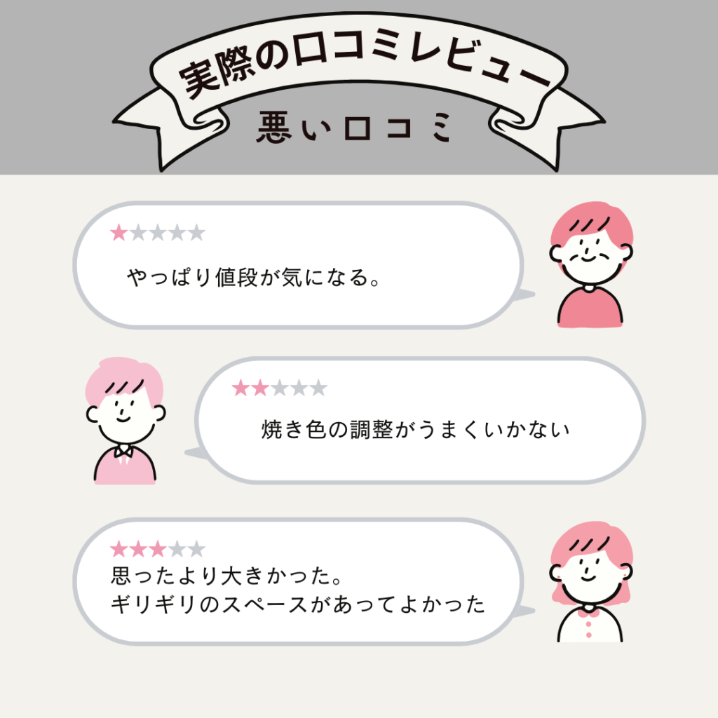 庫内はコンパクト設計のため、大きな調理器具を使いたい方には不向きという意見がありました。