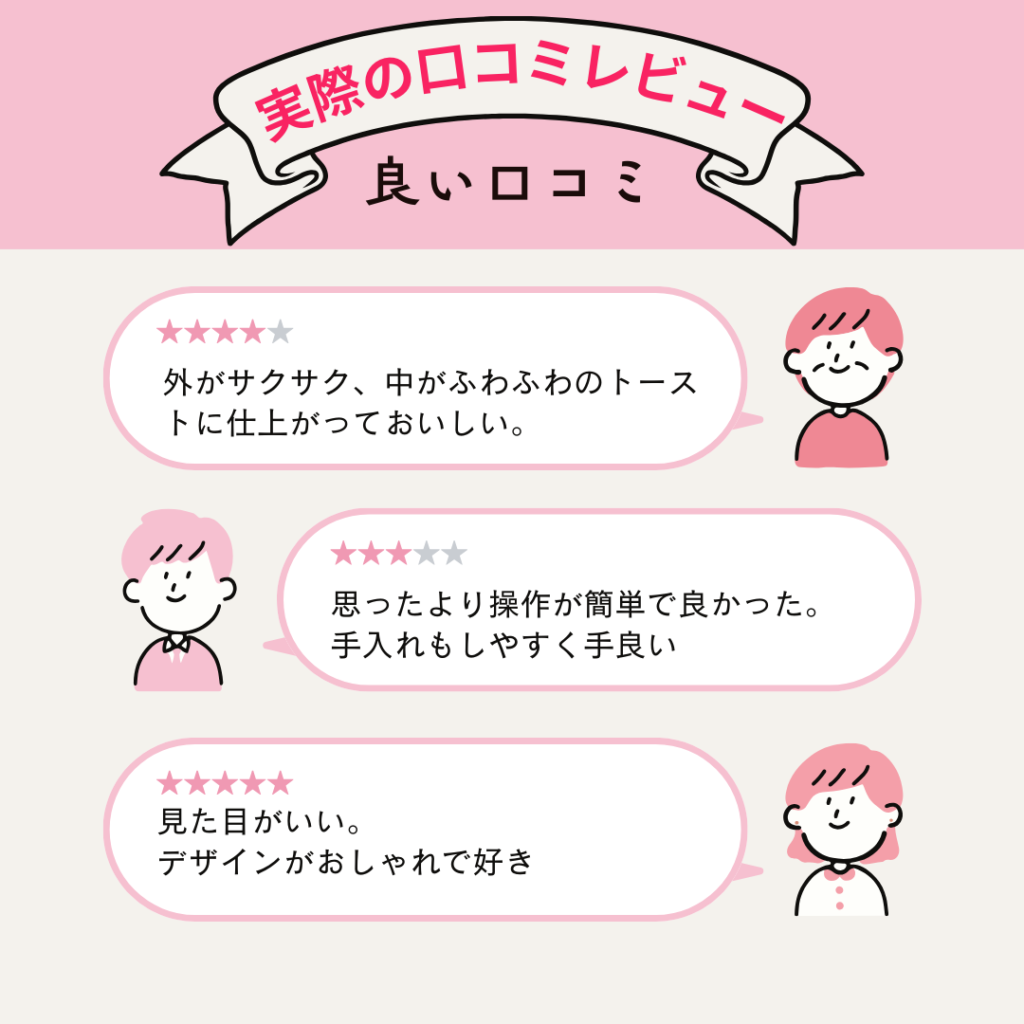 特に冷凍食パンの仕上がりについて、「これまでのトースターとは全然違う」という声が多数見られました。